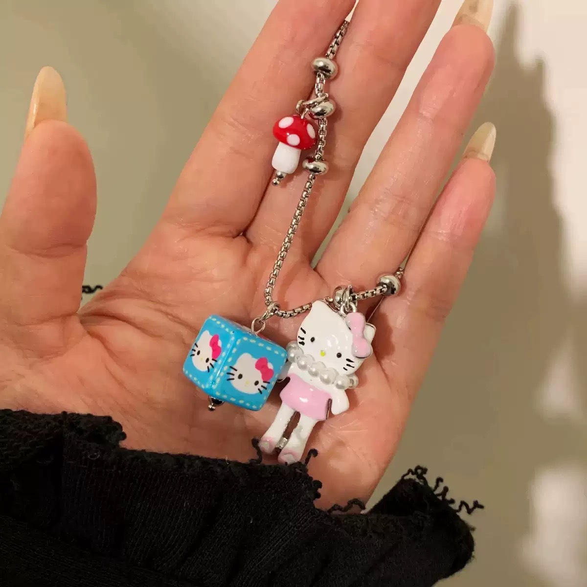 Japanese and Korean Cartoon Kt Cat Square Titanium Steel Necklace Cute Girl Stereo Pearl Necklace Niche Long Sweater Chain