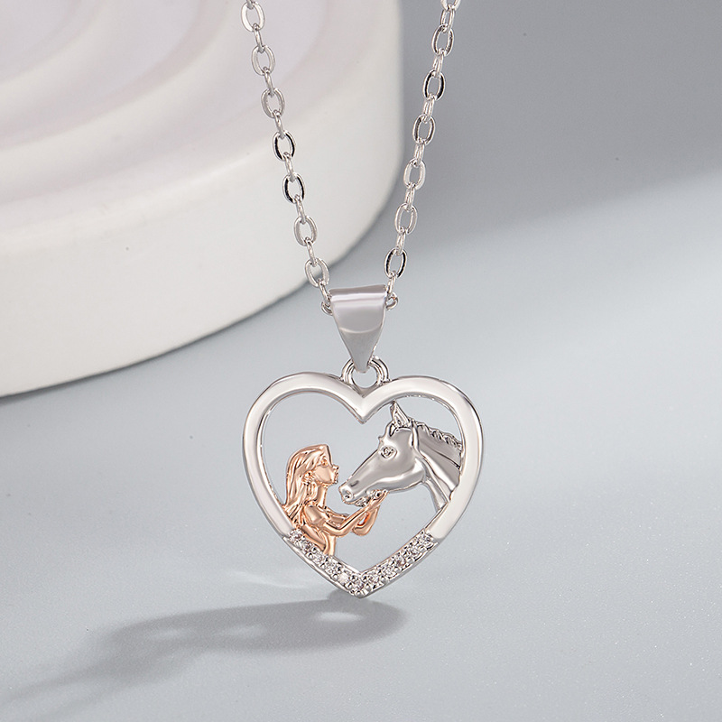 Cross-Border Amazon European and American Fashion Heart-Shaped Necklace Girl and Horse Two-Color Pendant High-Quality Rose Gold Jewelry