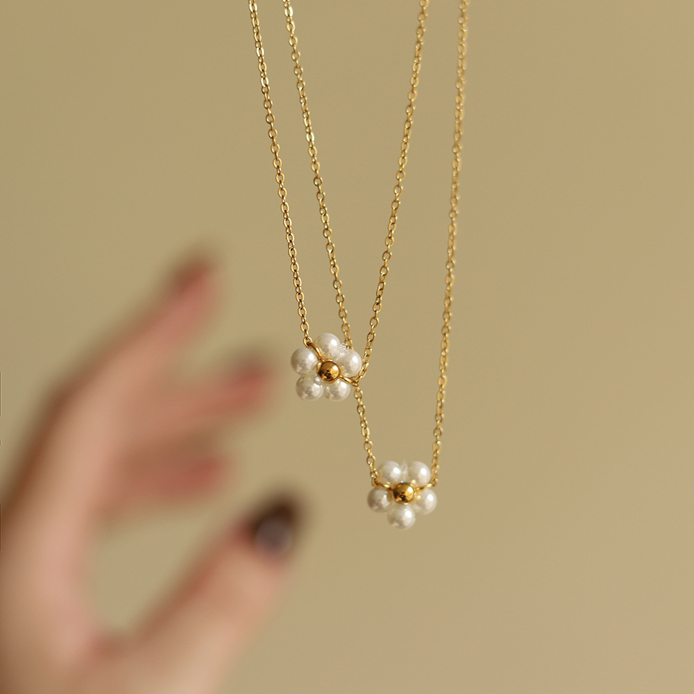 XL214 handmade flower Daisy girl student glass pearl necklace clavicle chain titanium steel plated 18K gold