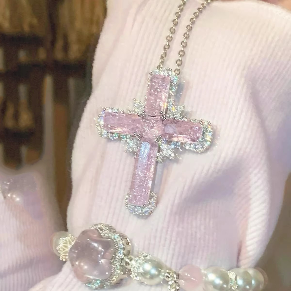 Pink Crushed Ice French Gentle Fairy Cross Pendant Necklace Sweet Girly Heart Cross High-Value Choker