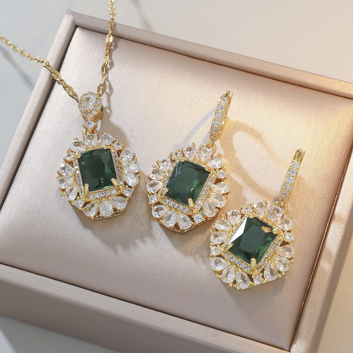 Necklace for Women Japanese and Korean Style New Ins Diamond Zircon Emerald Gemstone Elegant Girls Titanium Steel Clavicle Chain Jewelry