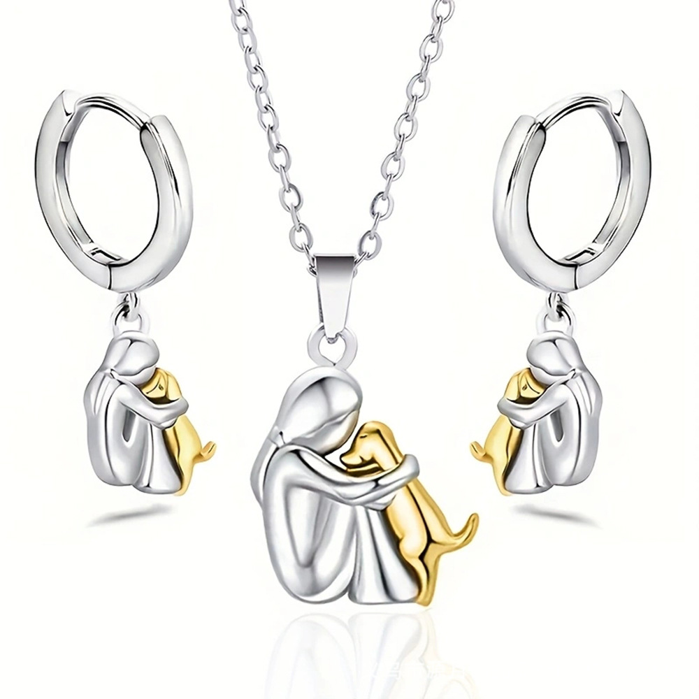 Cute and Fashionable Hot-Selling Little Girl and Dog Hug Necklace Earrings Ring Small Animal Pet Jewelry Jewelry Set