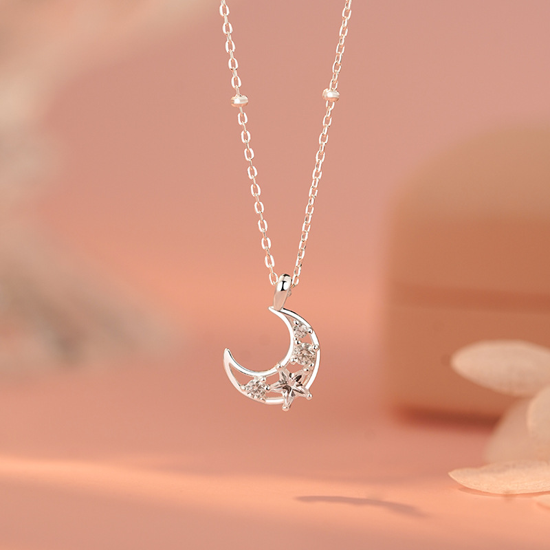 S925 Sterling Silver Korean Moon Star Necklace, Feminine, Sweet, Girly, Simple, Stacked Clavicle Chain