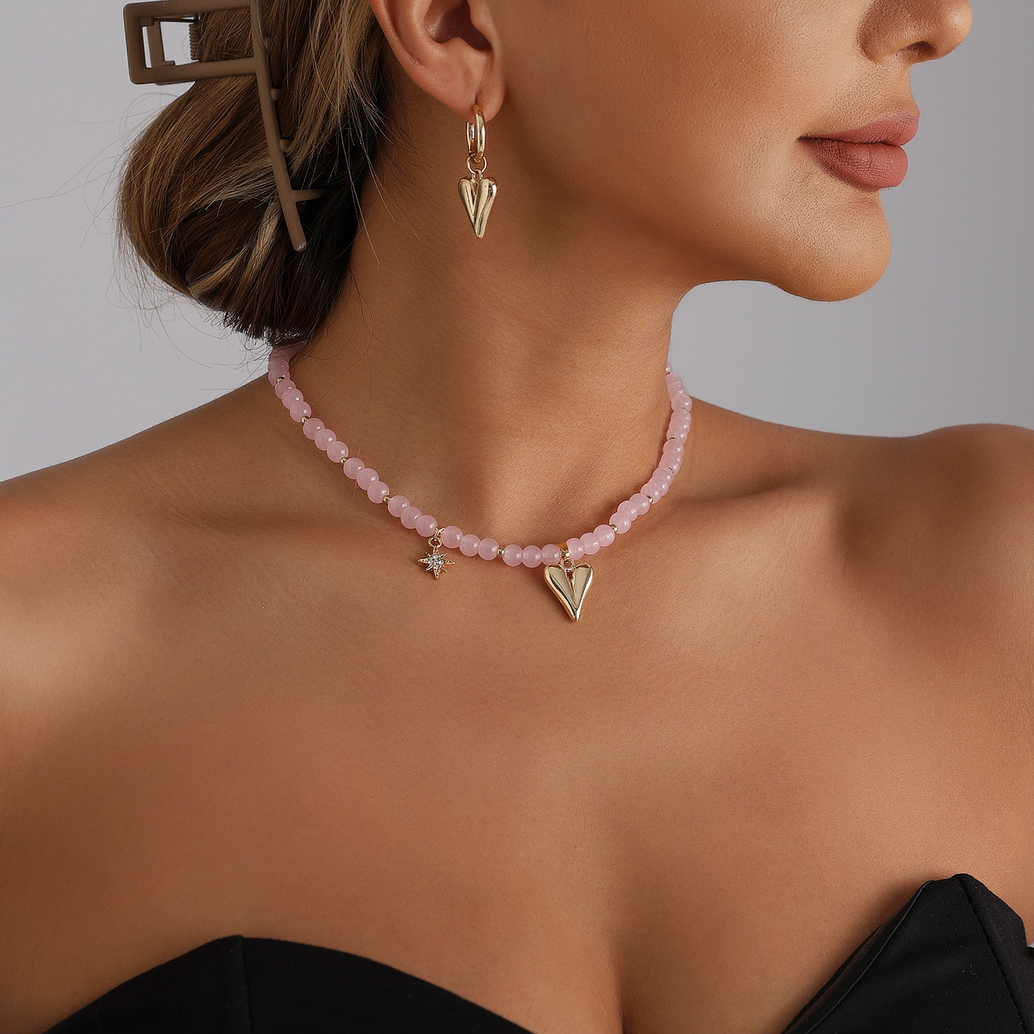 European and American Cross-Border Jewelry Pink Girly Round Bead Beaded Heart Necklace Ins Fashion Style Personalized Creative Necklace