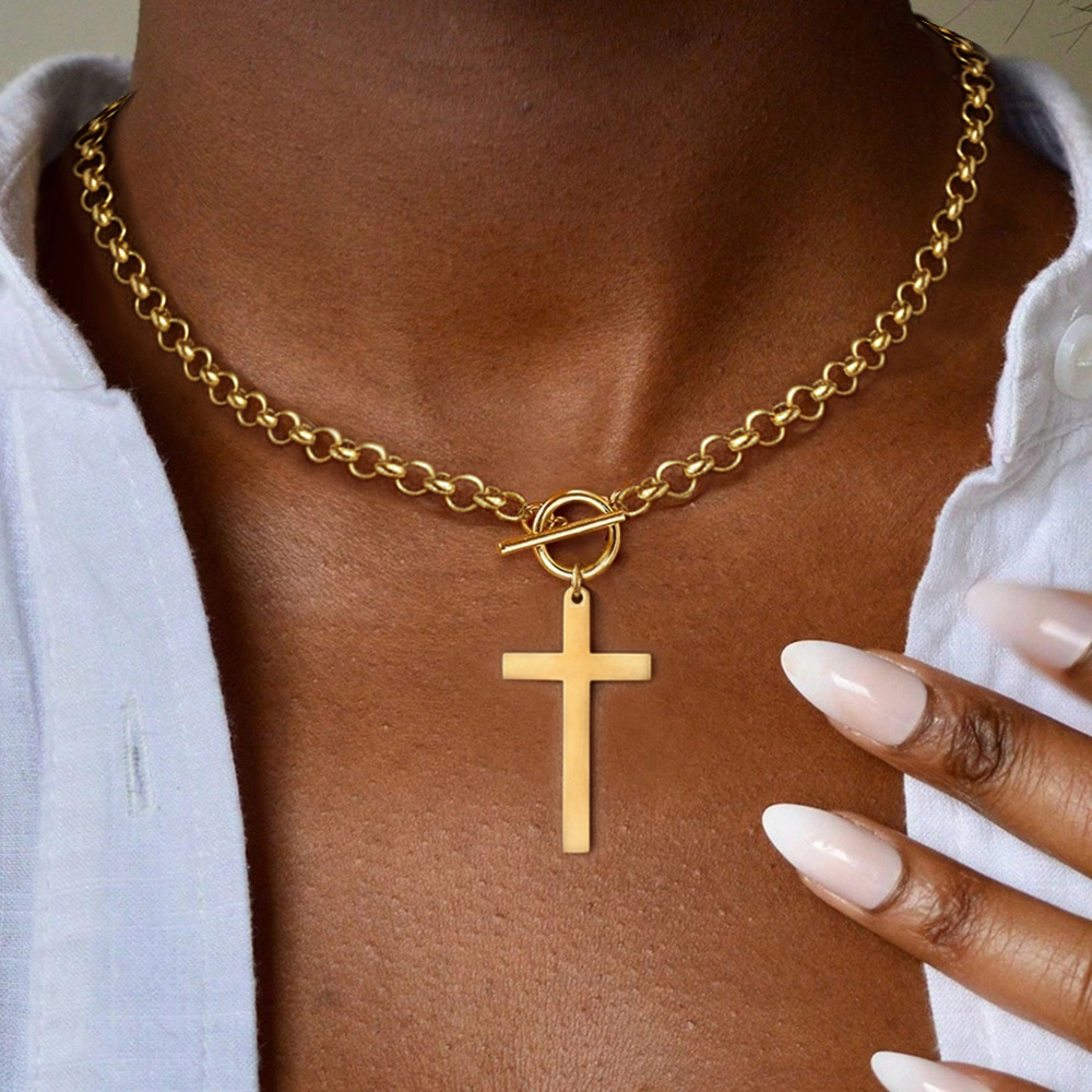 Stainless Steel Amazon Cross-Border New Cross Pendant Thick Necklace Women's Trendy Charm Ot Buckle Design Clavicle Chain