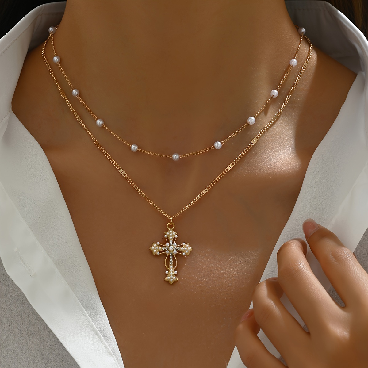Cross-Border European and American Multi-Layered Pearl Necklace for Women with Diamond Cross Pendant Necklace Trendy Personalized Neck Necklace
