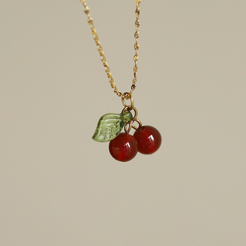 2023 New Red Cherry Red chalcedony titanium steel necklace female temperament girl sweet student cute fashion clavicle chain