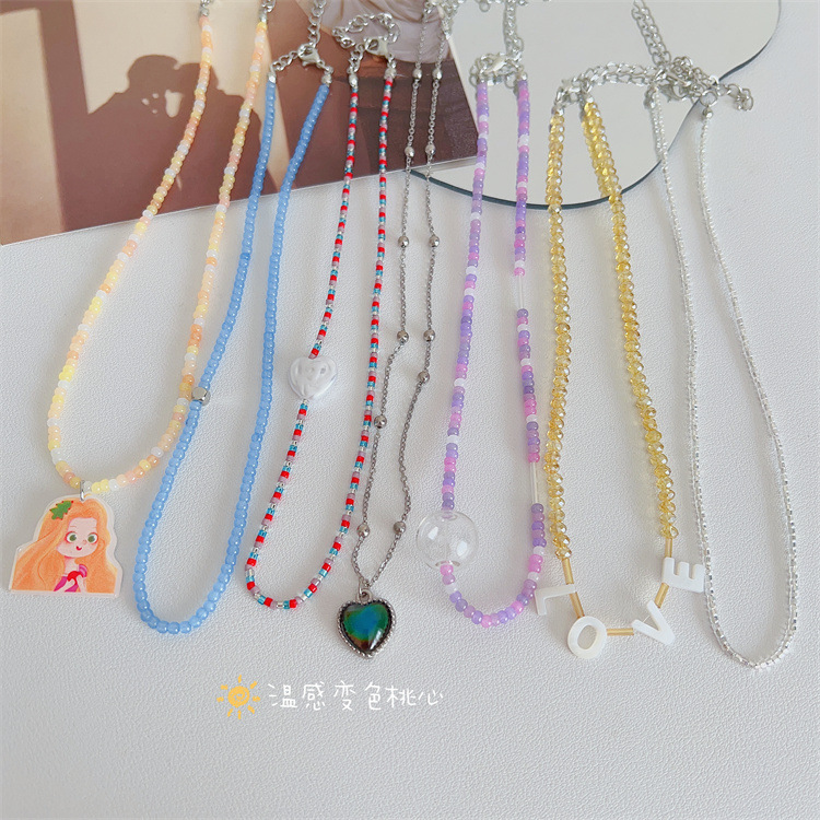 ins Style Cute Summer Colorful Beaded Necklace Peach Heart Glass Ball Girl Korean Clavicle Chain Glazed Necklace Chain