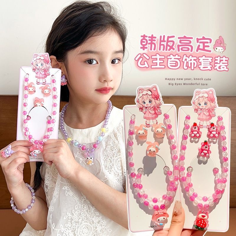 Children's Kuromi Bead Necklace Sweet Princess Jewelry Sanrio Pendant Necklace Children's Day Jewelry Ring Set