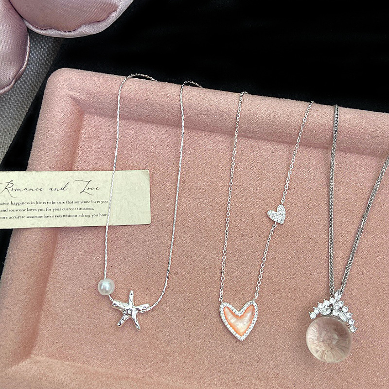 Natural Pink Mother-Of-Pearl Full Diamond Heart Starfish Pearl Transparent Ball Necklace Women's Summer Sweet and Exquisite Versatile Necklace