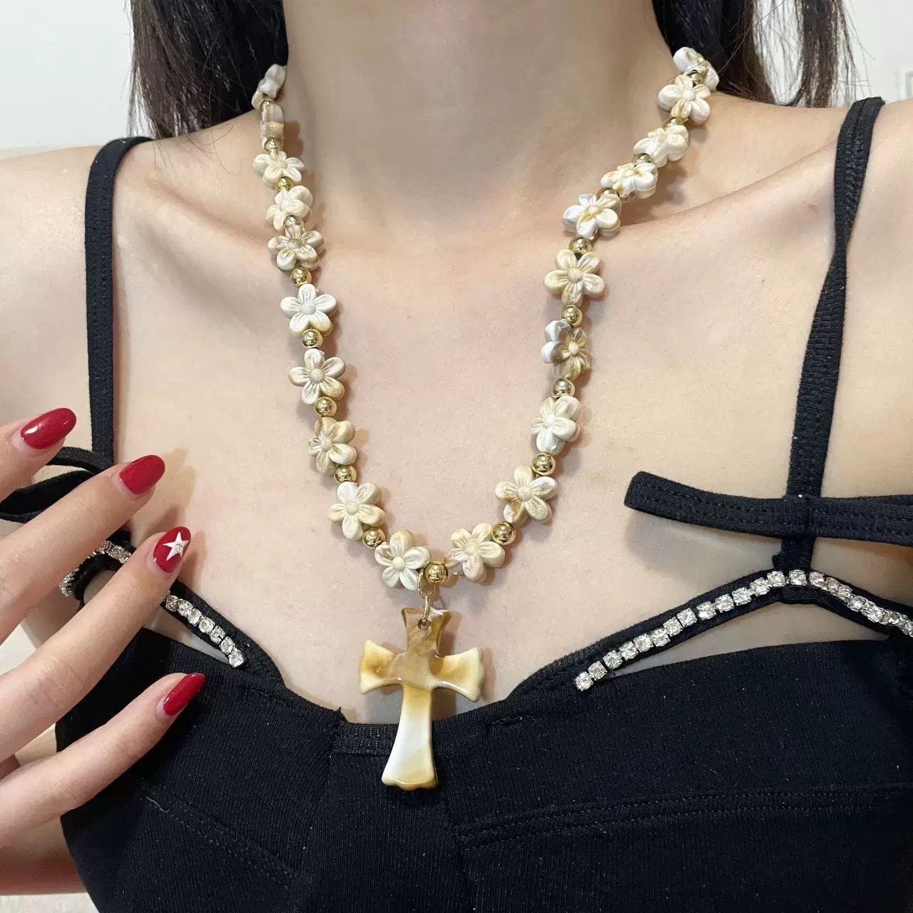 Sweet Cool Fashion Light Luxury Flower Cross Pendant Necklace Sweet Mori Pastoral Style High-grade Necklace Necklace