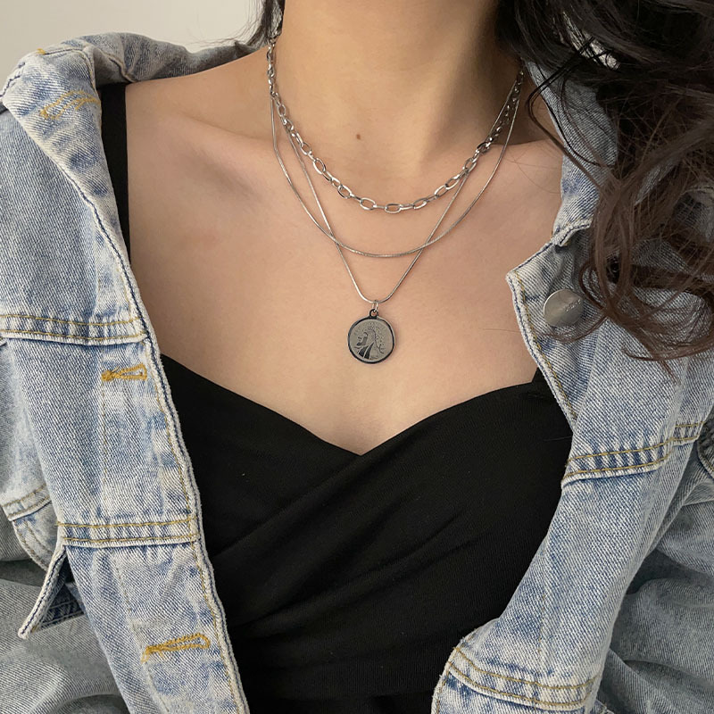 Multi-layer Stacked Round Brand Pendant Titanium Steel Necklace Men's ins Trendy Hip-hop Simple Color-free Collarbone Chain Women's Woolen Chain