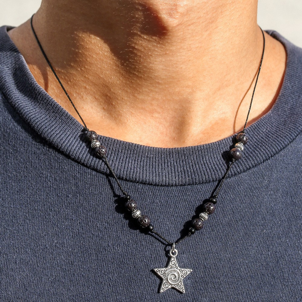 Cross-Border New Product European and American Retro Style Five-Pointed Star Pendant Volcanic Stone Men's Necklace Personalized Adjustable Necklace for Men