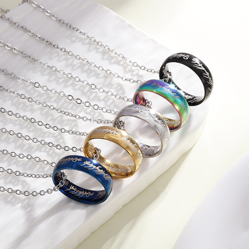 European and American cross-border new titanium steel round ring necklace fashion trendy men's magic ring lettering stainless steel necklace men's ring