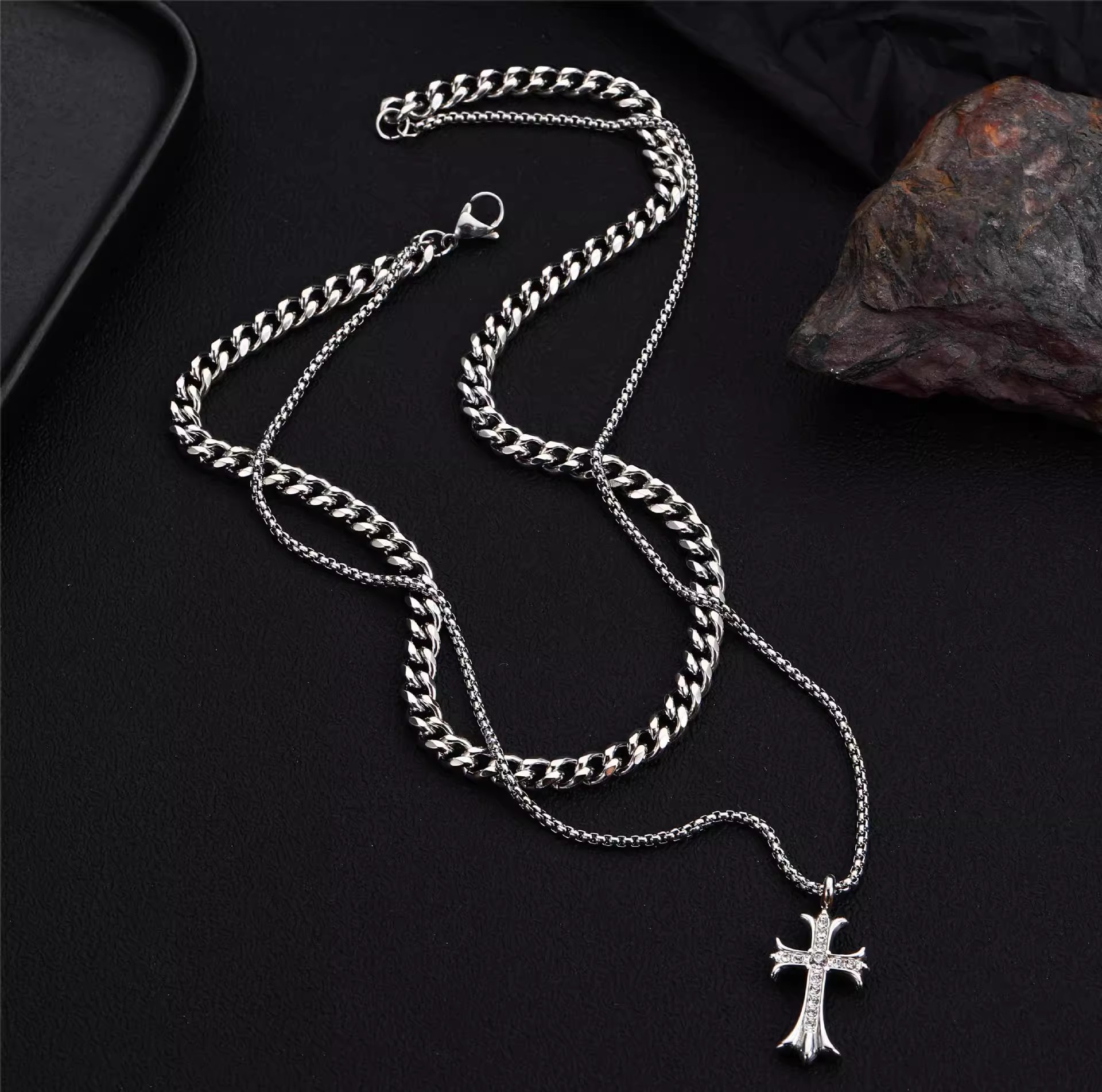 Cross-border fashion double-layer Cuban titanium steel necklace high-end sense hip-hop full diamond cross pendant necklace men's jewelry