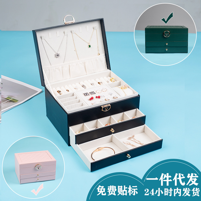 New Diamond-Patterned Three-Layer Drawer Jewelry Box with Lock for Jewelry Necklaces, Rings, Earrings, and Accessories Storage