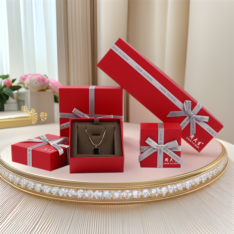 Chow Tai Sang Bow Heaven and Earth Cover Jewelry Ring Box Ribbon Imitation Microfiber Gold Gift Box Bracelet