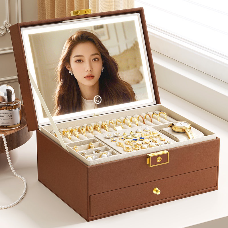 Pu Leather Jewelry Box Home Large Capacity Drawer Jewelry Storage Box High-End Led Jewelry Storage Box with Mirror