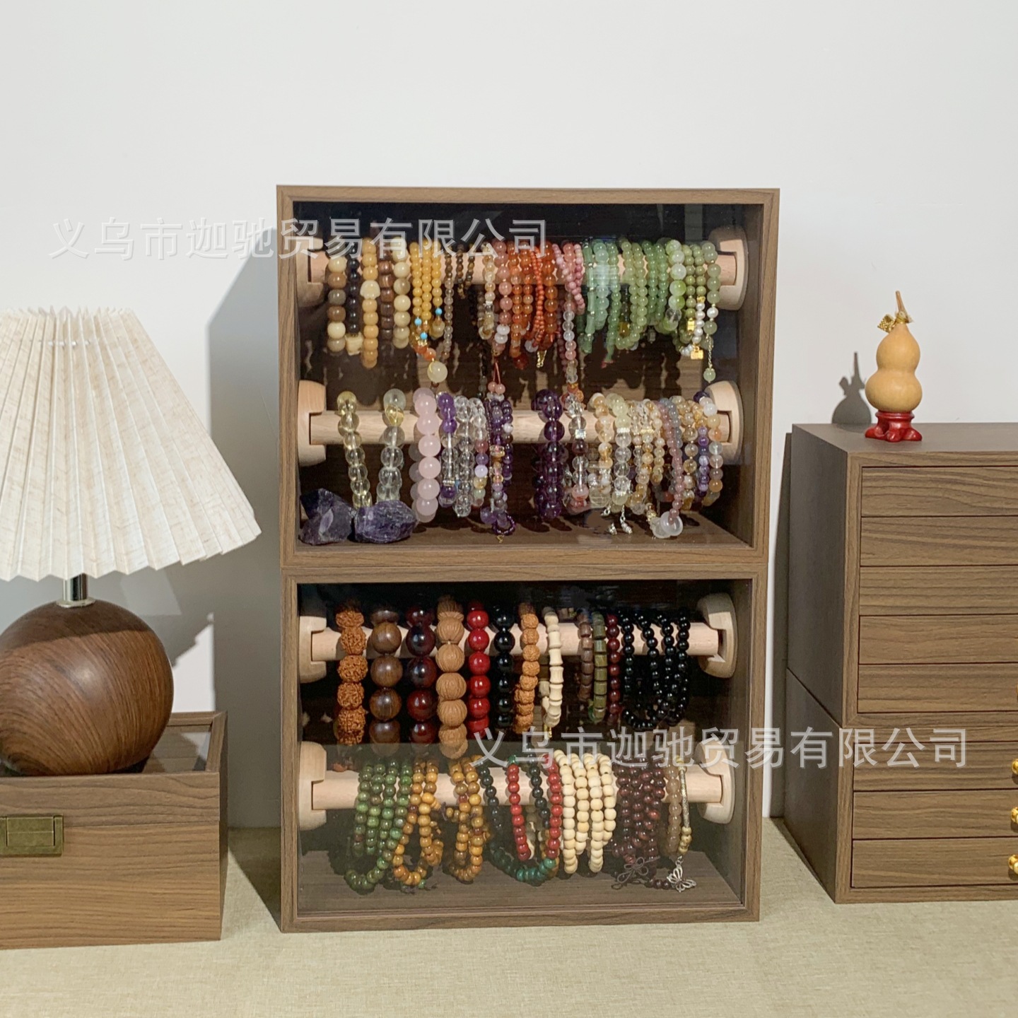 Bracelet Storage Box Desktop Retro Double-Layer Wood Grain Jewelry Cabinet Dust-Proof Jewelry Crystal Bracelet Display Shelf