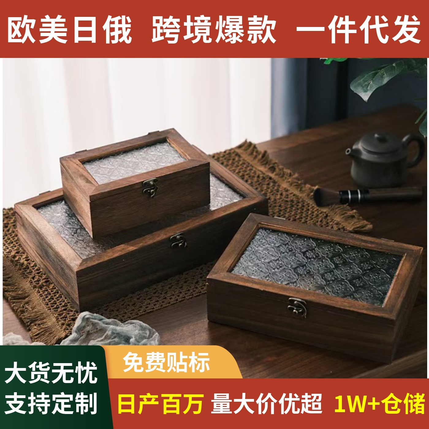 Wooden Vintage Sundries Storage Box Household Tung Wood Dustproof Flip Jewelry Box Begonia Flower Glass Desktop Storage Box