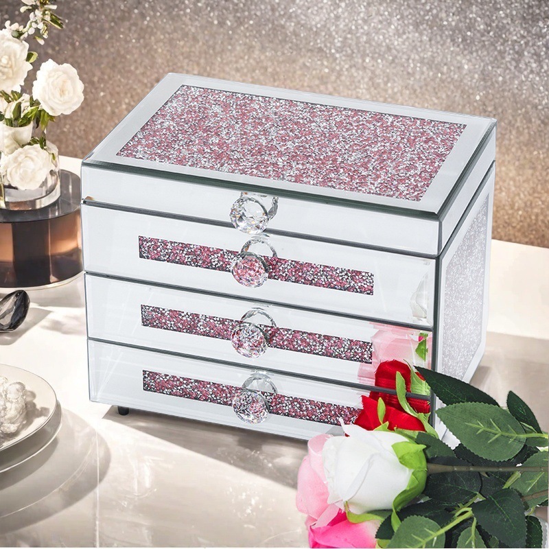 Jewelry Storage Box Large Capacity Pink Rhinestone Mirror Glass High-end Desktop Light Luxury Jewelry Jewelry Storage