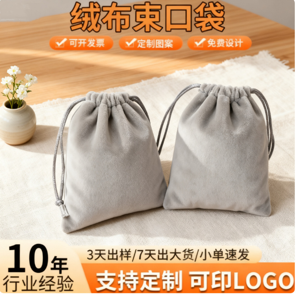 Gray Velvet Drawstring Flap Pocket Pants with Large Capacity and Logo Printing, Glasses and Jewelry Storage Bag, Velvet Drawstring Flap Pocket Pants Customization