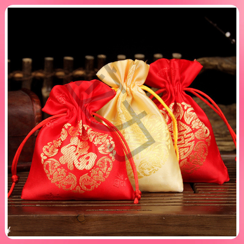 Manufacturer Wholesale Brocade Small Lucky Bag Packaging Bag Red Cloth Bag Antique Style Gift Bag with Printed Blessing Words