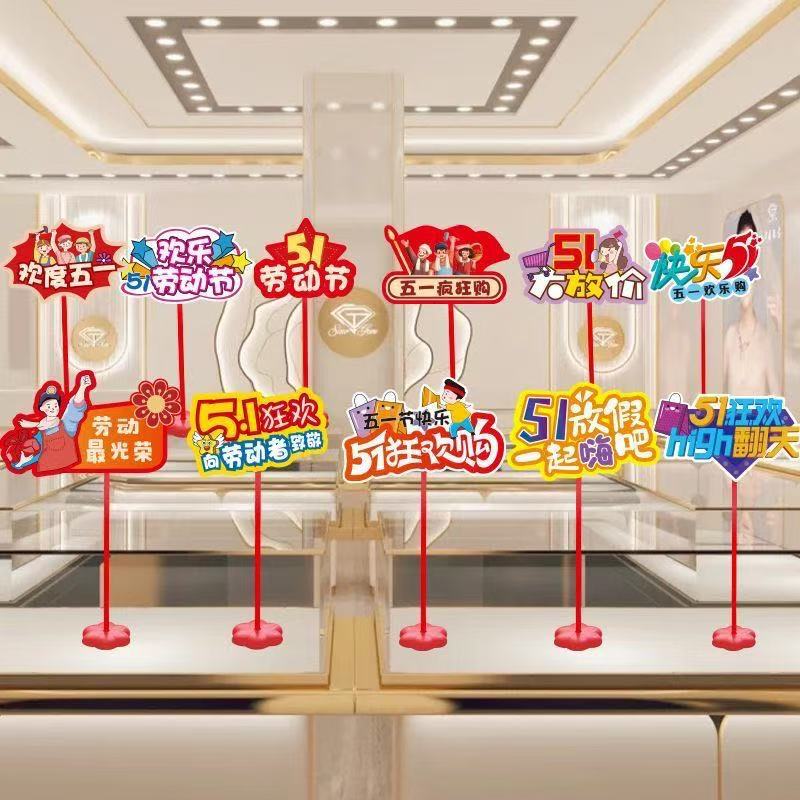 May Day Labor Day hand-held sign decoration shops, shopping malls, storefront activities, ornaments, jewelry shops, supermarkets, scene layout