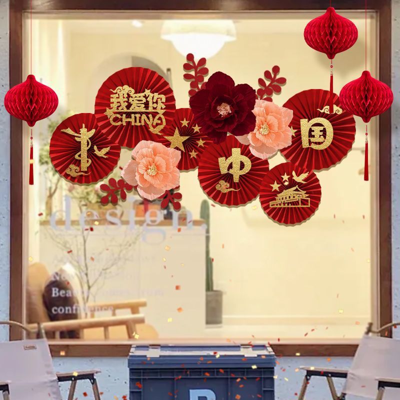 Mid-Autumn Festival and National Day Decoration Window Shop Shopping Mall Jewelry Store Background Wallpaper Fan Flower Atmosphere Scene Layout Supplies