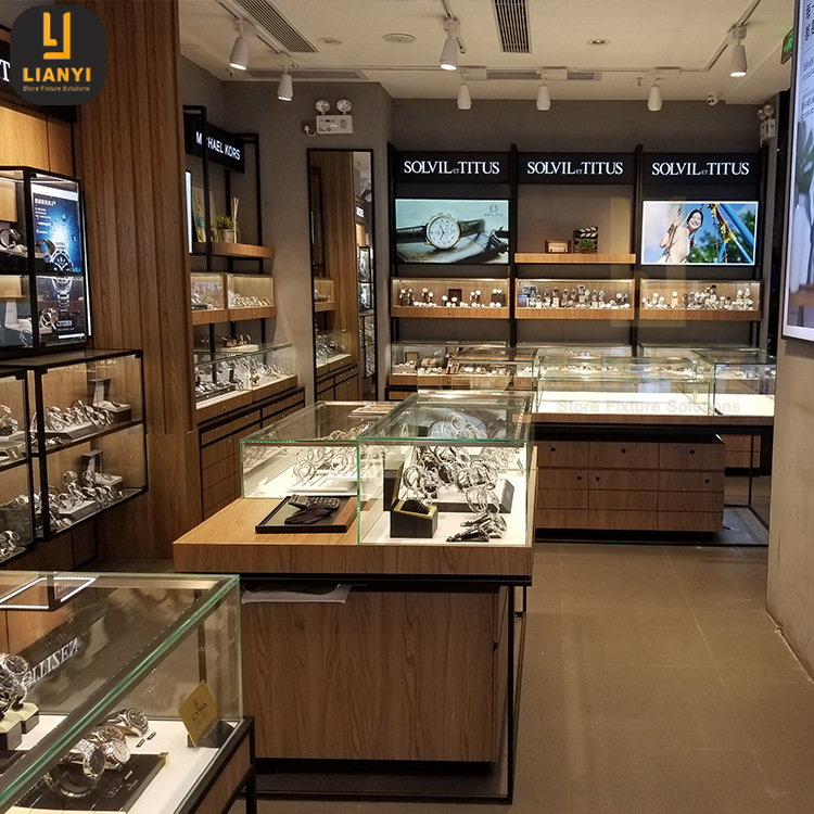 Shop Wrist Watch Glass Counter Display Case with Light Custom Wooden Glass Iron Frame Display Case Jewelry Watch Showcase