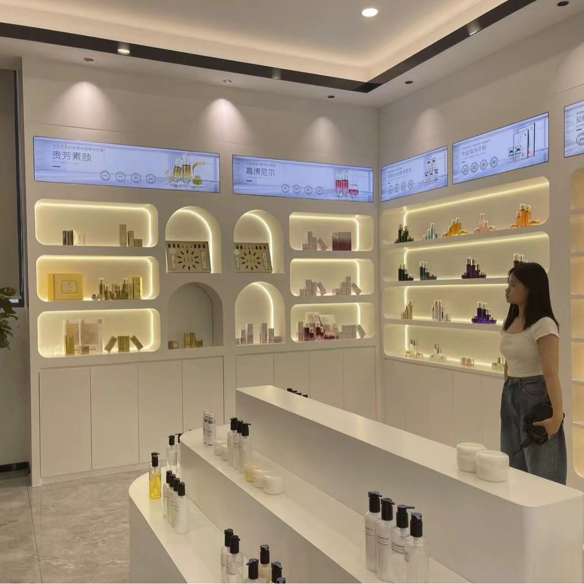 White Paint Display Rack, Beauty Salon Shelf, Skin Care Product and Makeup Display Rack, Corner High Cabinet, Customizable Jewelry Rack