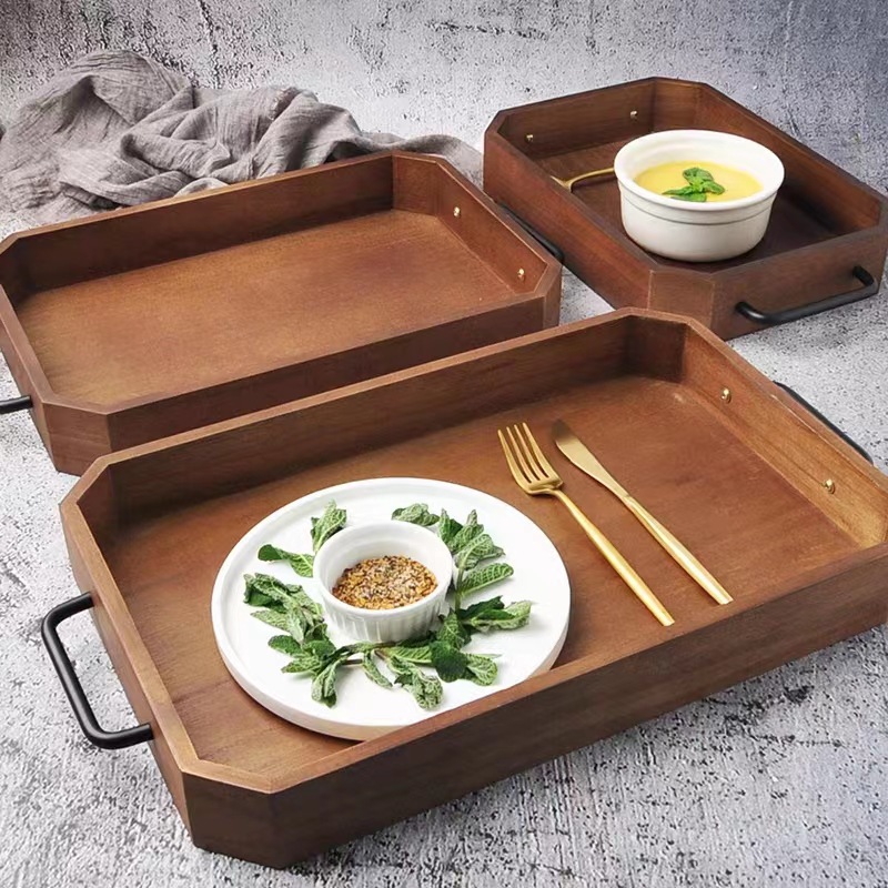 Vintage Rectangular Solid Wood Tray Iron Handle Household Afternoon Tea Dim Pot Coffee Plate Bread Fruit Display Plate