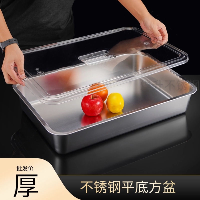 Stainless Steel Dinner Plate Rectangular Square Basin with Transparent Lid Flat Bottom Tray Fruit Basin Cold Dishes Cooked Food Display Plate