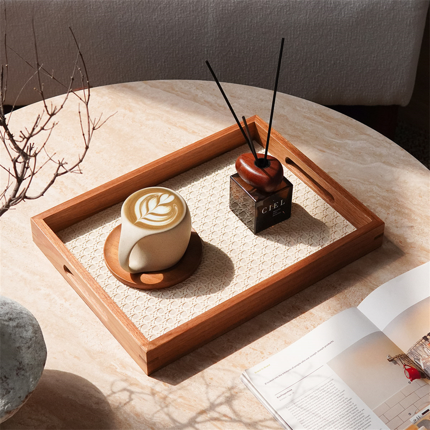 Solid Wood Frame Rattan Leather Tray Wholesale Chinese Retro Handle Aromatherapy Pattern Entrance Key Storage Tray Ornaments