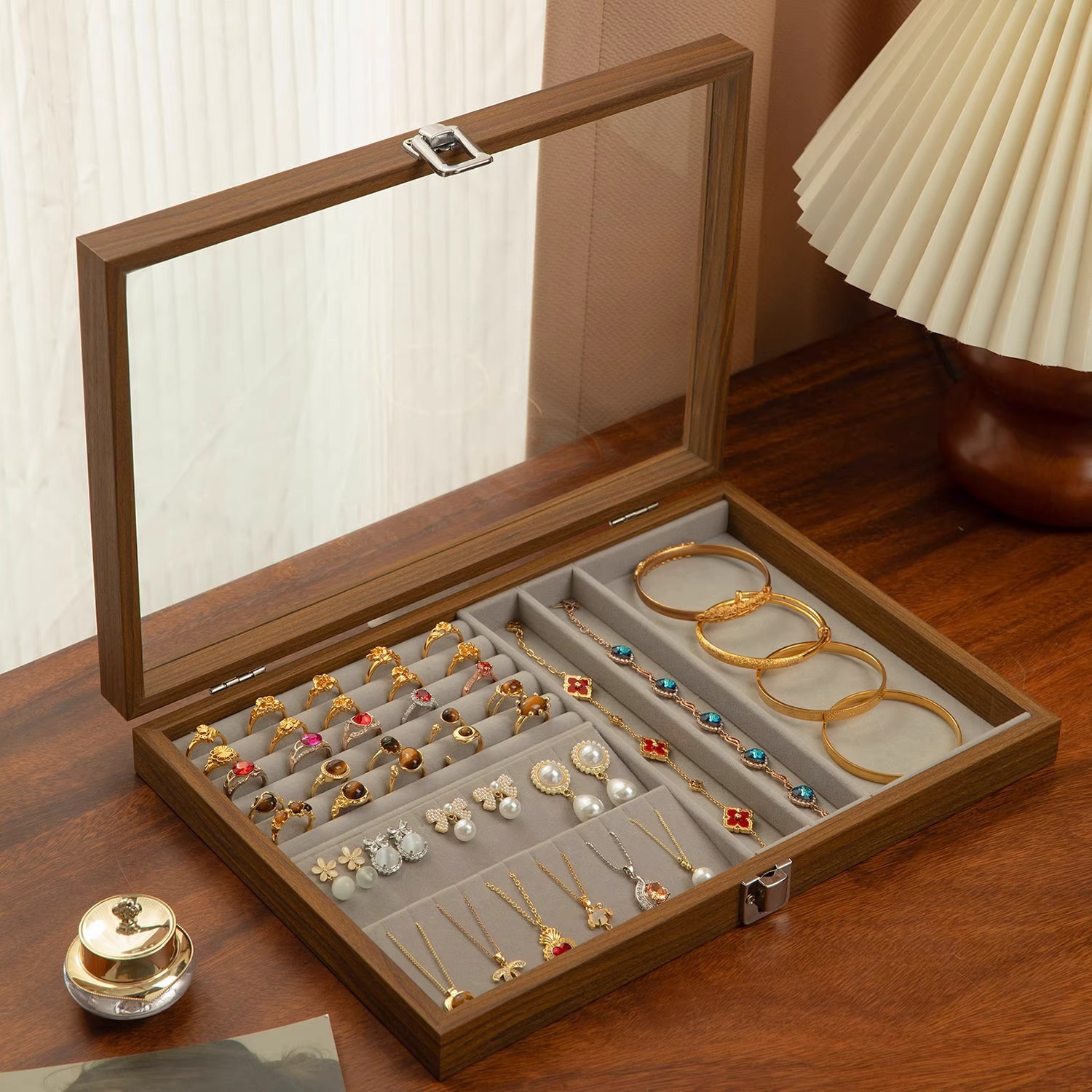 Jewelry Storage Box, High-End Exquisite Jewelry Necklace, Ring, Earrings, Earrings Display, Large-Capacity Wooden Single-Layer Tray