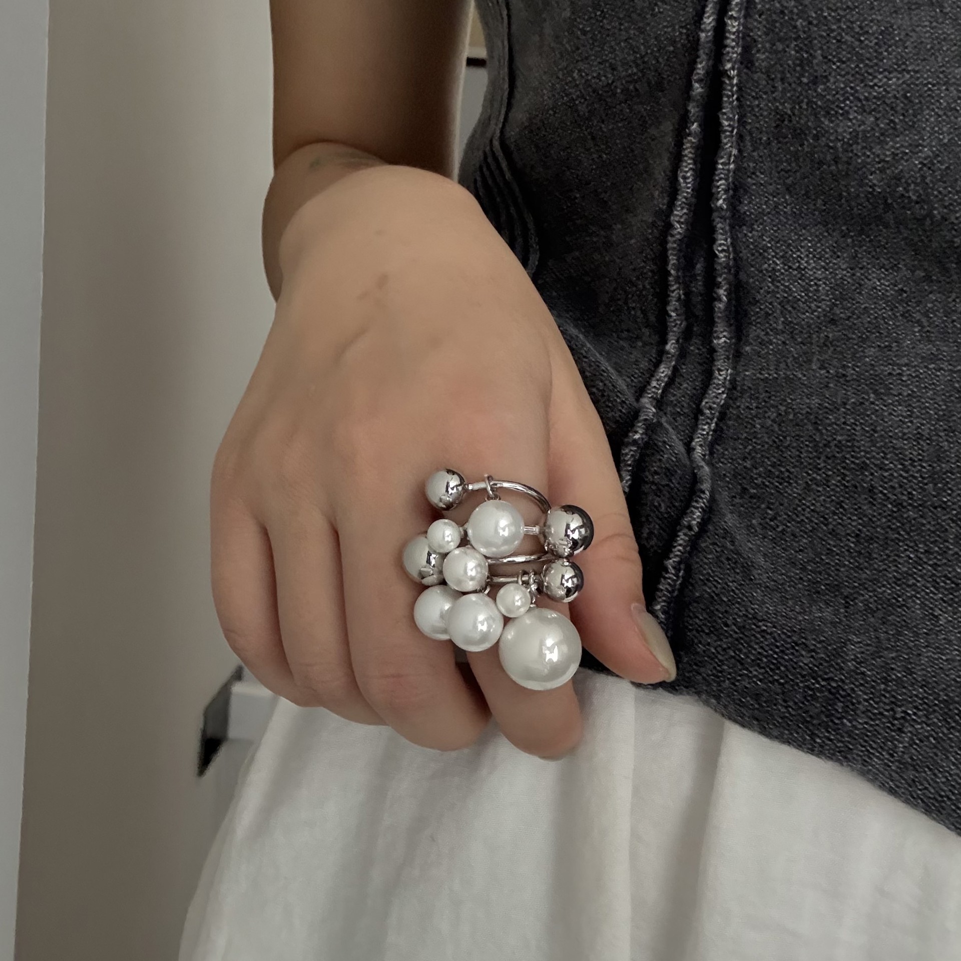 Korean Retro Design Silver Niche Pearl Beaded Handmade Exquisite Heavy Industry Ring Niche High-End Index Finger Ring for Women