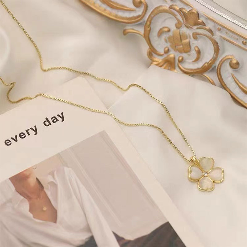 Dongdaemun Ins Style Cat's Eye Stone Titanium Steel Four-Leaf Clover Necklace, Fresh and Simple Heart-Shaped Petal Forest Style Clavicle Chain