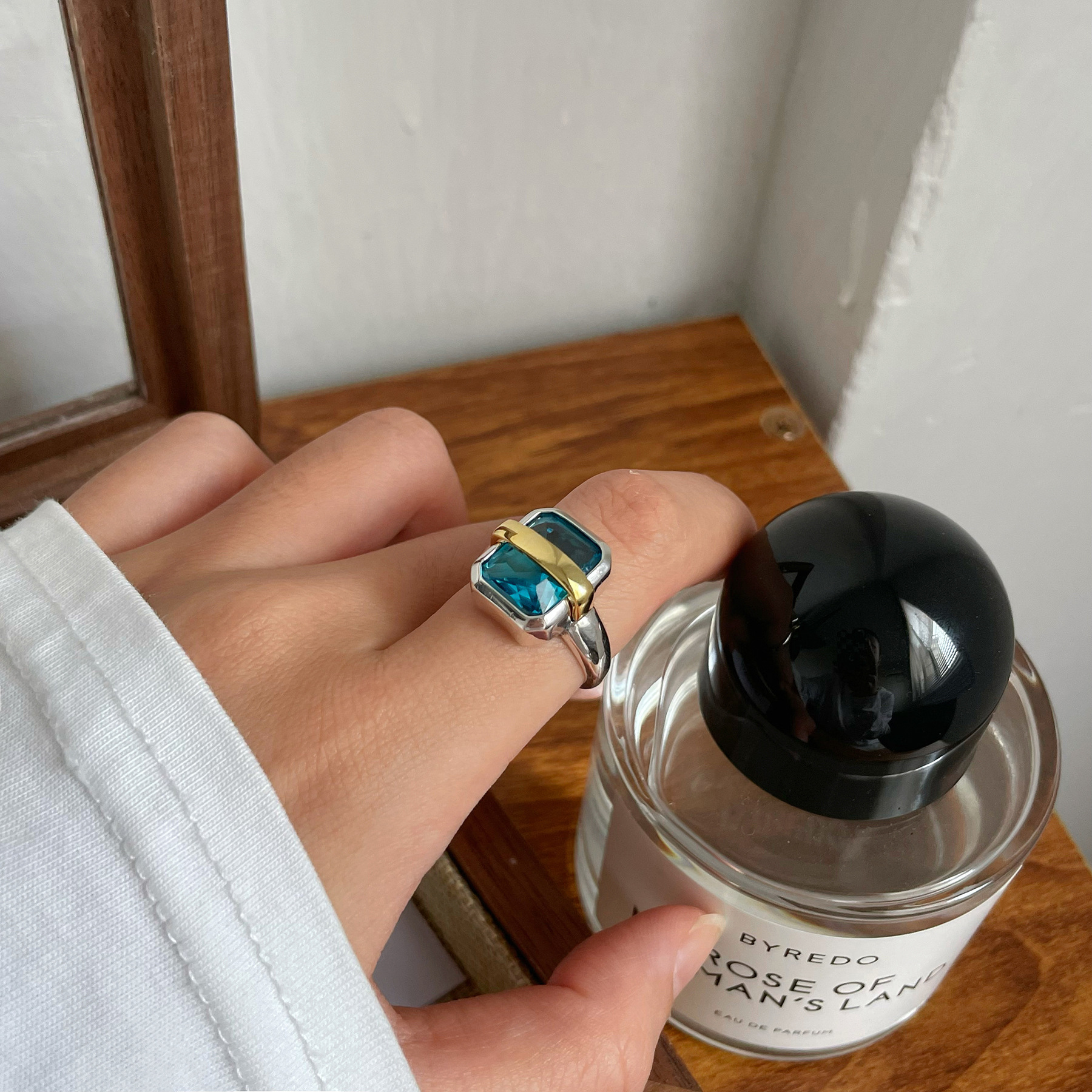 Japanese and Korean geometric square ring Women's retro fashion beautiful sapphire blue zircon open ring index finger ring fashion
