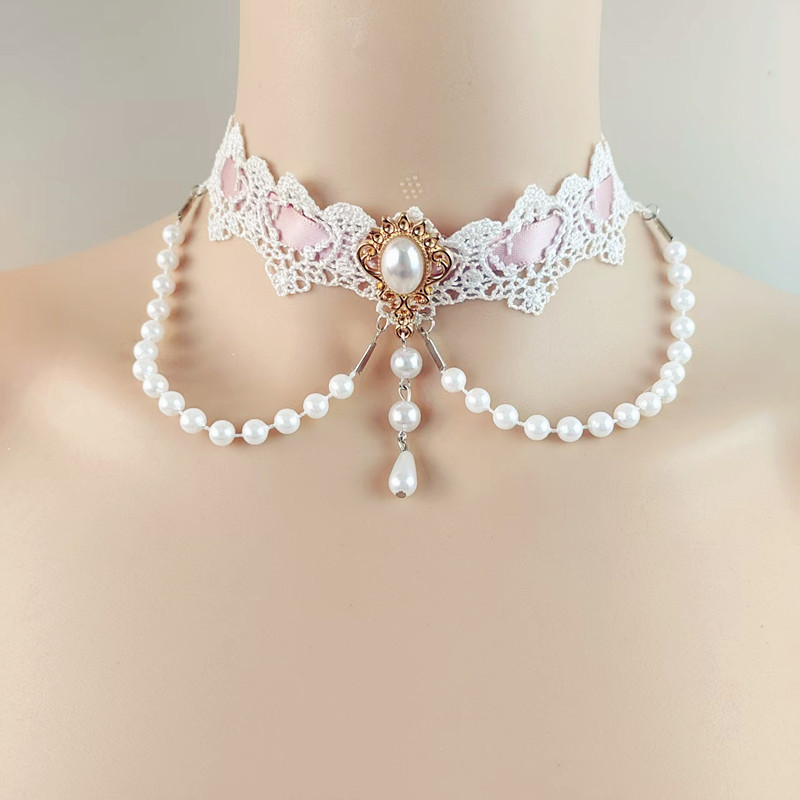 Korean Version Cross-Border European and American Necklace White Pearl Lace Pink Ribbon Women's Choker Tassel Necklace Pearl Choker