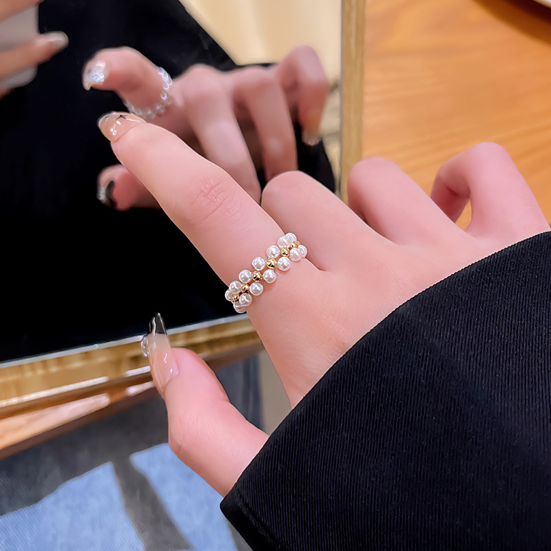Adjustable elastic rope pearl ring female ins style niche fashion personality ring retro simple hand jewelry