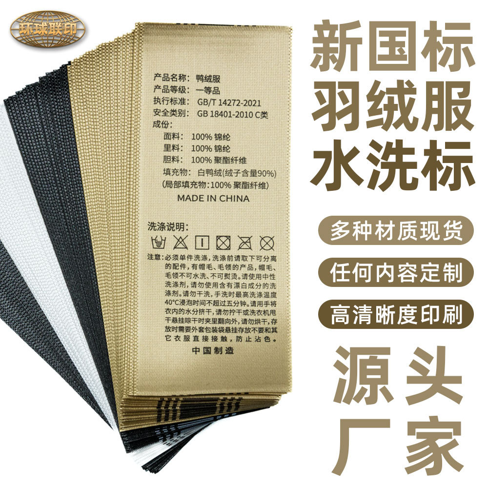 In-Stock New National Standard down Jacket with Washed Label, Gold Woven Edge Satin Ribbon, Custom Soft Board Printing, Washable