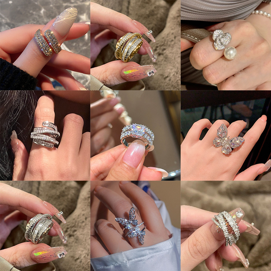 European and American Cross-Border Real Gold Electroplated Diamond Open Ring Accessible Luxury High-End Index Finger Ring Niche Fashion Elegant Hand Jewelry