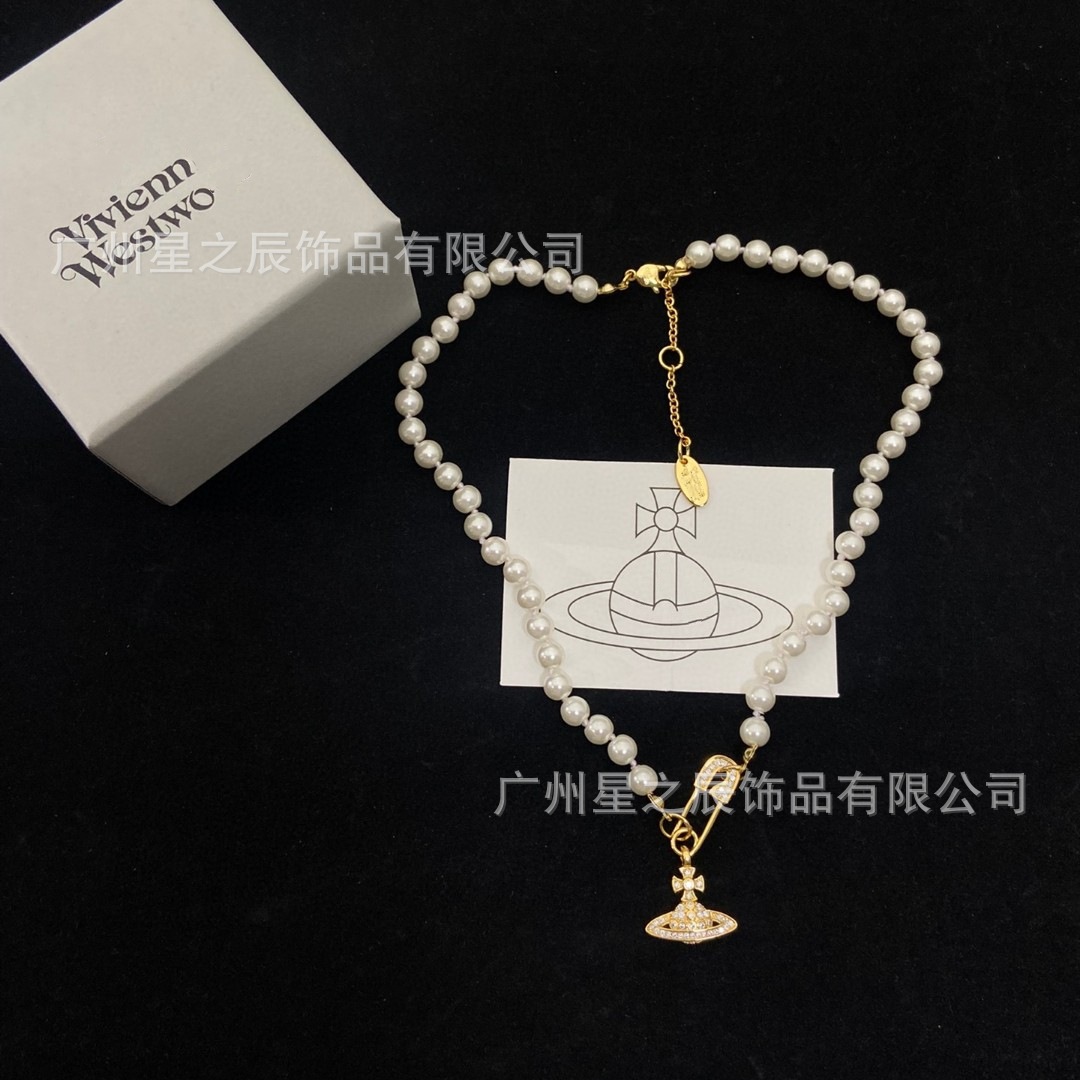 [True Same Edition] Empress Saturn Pin Pearl Full Diamond Necklace for Women High-End Light Luxury Clavicle Chain