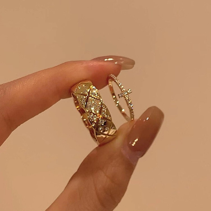 2025 Vintage Diamond-Studded Rhombus Wide Ring, Chanel-Inspired Light Luxury Style, Full Diamond Cross Stackable Index Finger Ring
