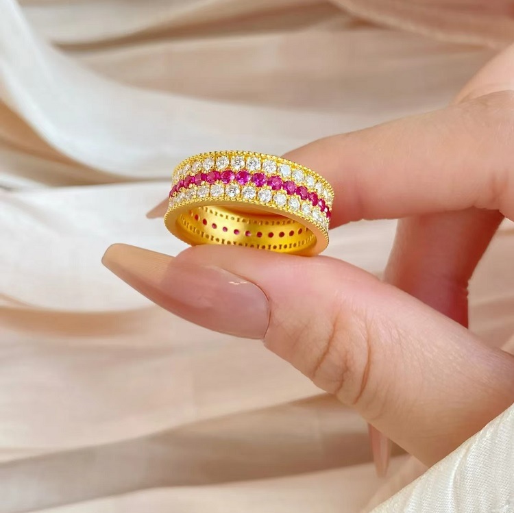 Light Luxury High-grade Middle-ancient Style Color Ruby Three-row Diamond Ring New Fashion Luxury Elegant Finger Ring