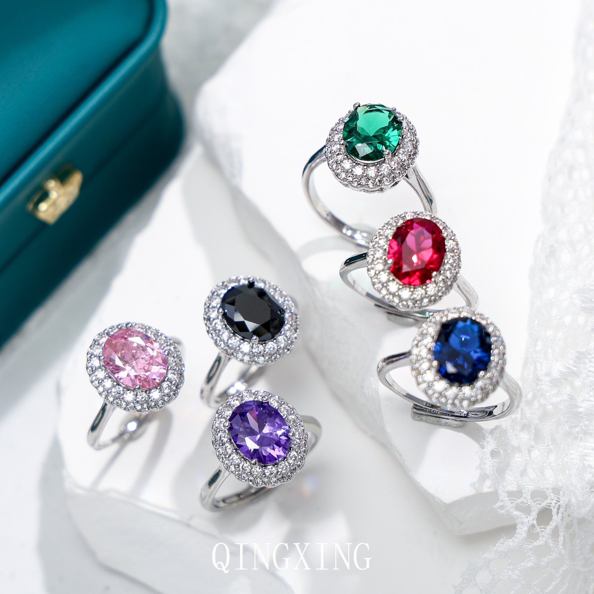 Cross-Border Fashion European and American Zircon Colored Gemstone Adjustable Ring with a Luxurious, Elegant, and High-End Feel Featuring Red and Blue Sapphires and Pink Diamonds