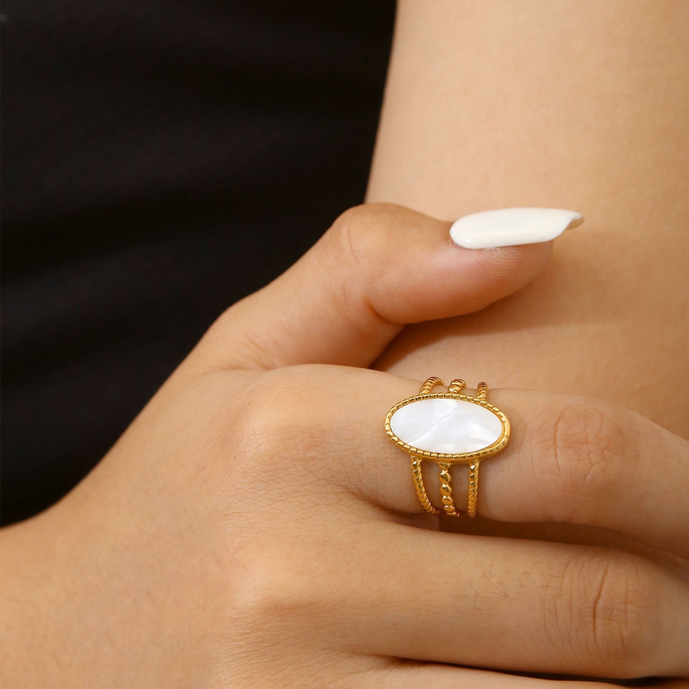 Elegant, Fashionable, Luxurious and High-End Oval Ring Inlaid with Mother-Of-Pearl Stainless Steel Plated 18K Gold Women's Ring