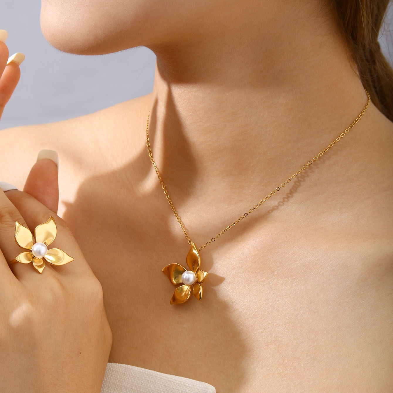 Elegant Fashion Luxury Stylish Flower Inlaid Pearl Stainless Steel Plated 18K Gold Ladies Necklace Ring Set