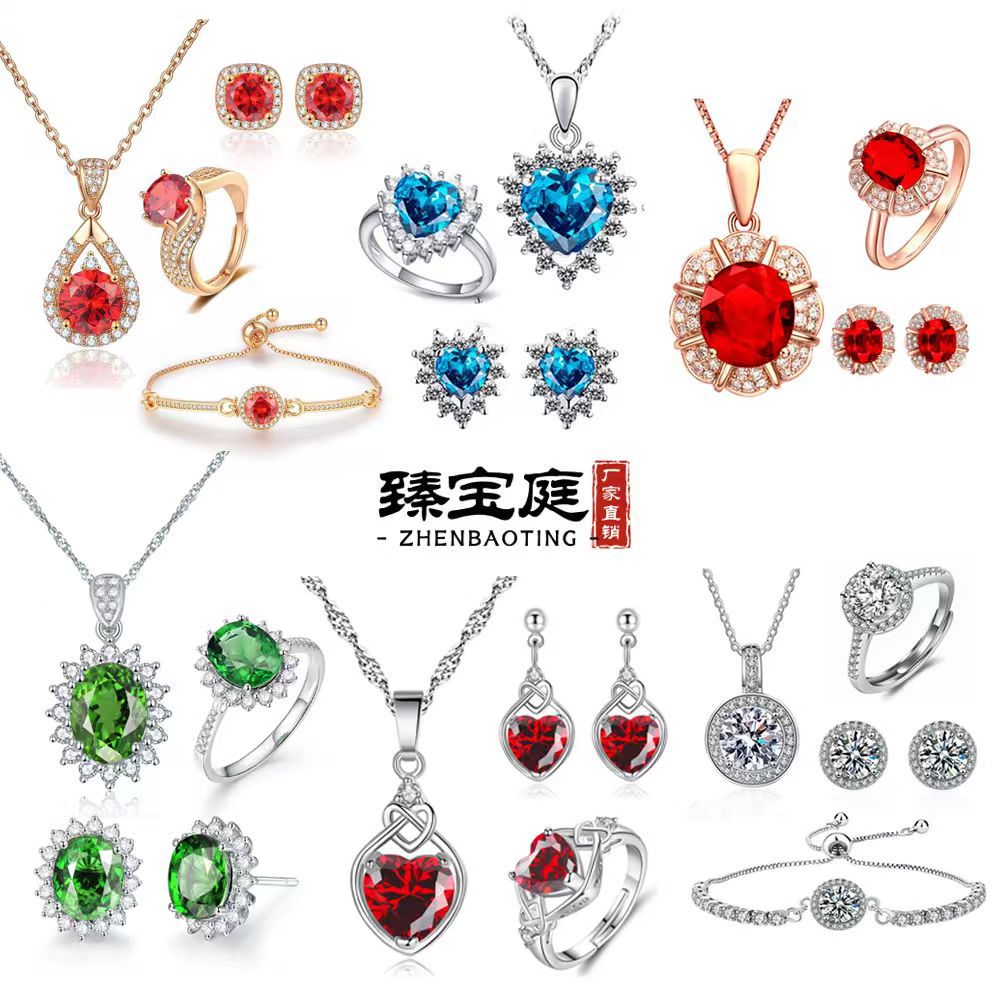 Amazon Foreign Trade Light Luxury Noble Texture Pink Blue Green Gemstone Zircon Jewelry Three or Four Piece Set Ring Necklace