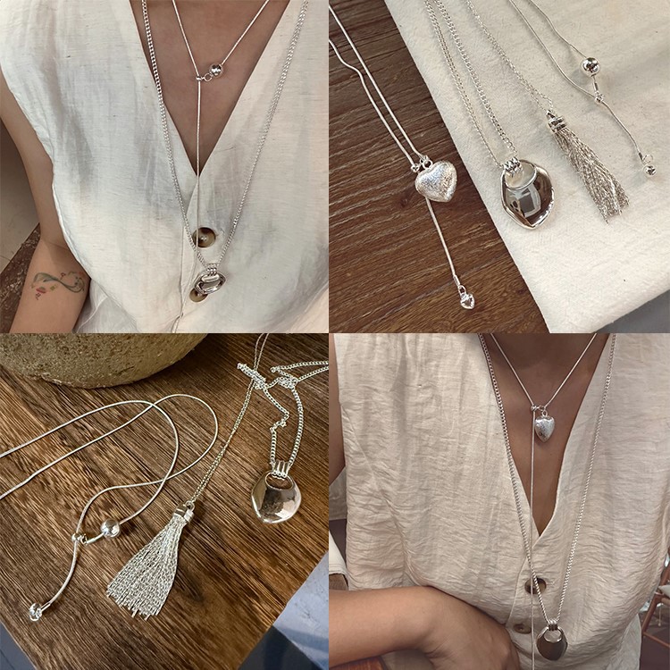 Silver Brushed Heart Pendant Necklace for Women Ins Niche Simple Tassel Ball Long Sweater Chain Versatile Accessories